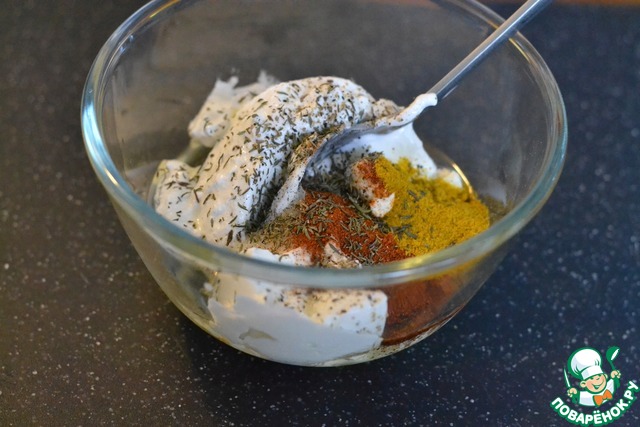 В отдельной миске смешать сметану, соль, черный перец, паприку сладкую, карри, тимьян, чеснок и перец чили.