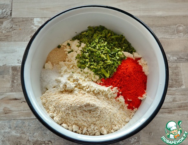 Смешайте в миске оба вида муки, соль, сухие дрожжи, сушеную зелень и паприку.