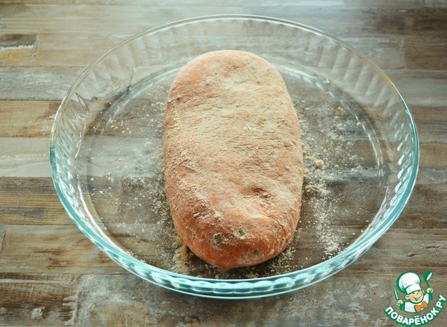 Затем этот шар слегка растяните, чтобы получить форму батона. Обильно обмажьте хлеб мукой и поместите на противень или в форму.