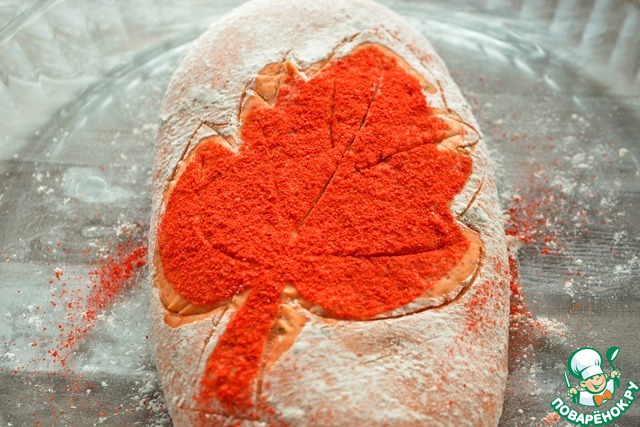 Из бумаги вырежьте трафарет листа, приложите его к хлебу. Пальцем аккуратно, но обильно, смажьте центр трафарета водой