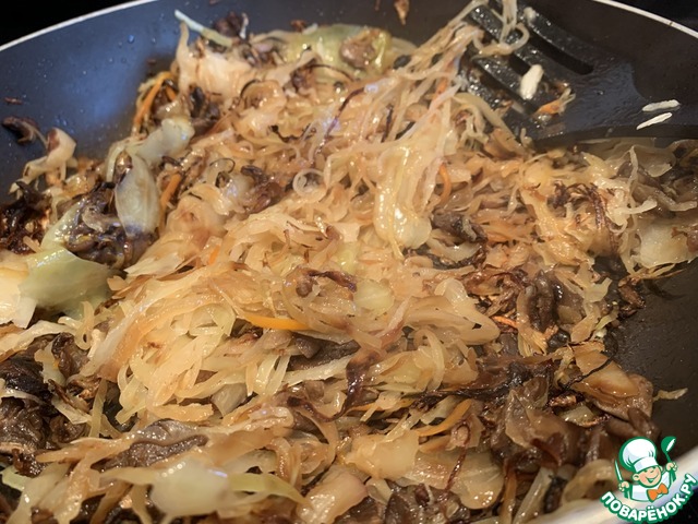 Добавьте квашенную капусту, тушите помешивая около 10-12 минут, до готовности. Начинка готова.