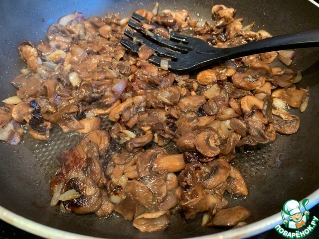 На раскалённую сковороду налейте растительное масло и обжарьте лук до прозрачности. Добавьте нарезанные шампиньоны и жарьте около 10 минут, пока не выпарится вся жидкость.