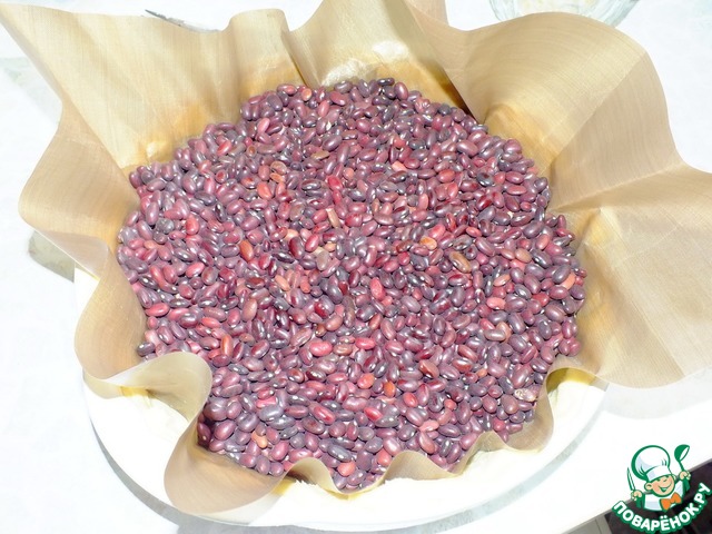 «Натан раскатал тесто скалкой и выложил в форму; потом накрыл пергаментной бумагой, насыпал фасоль и поставил в духовку».