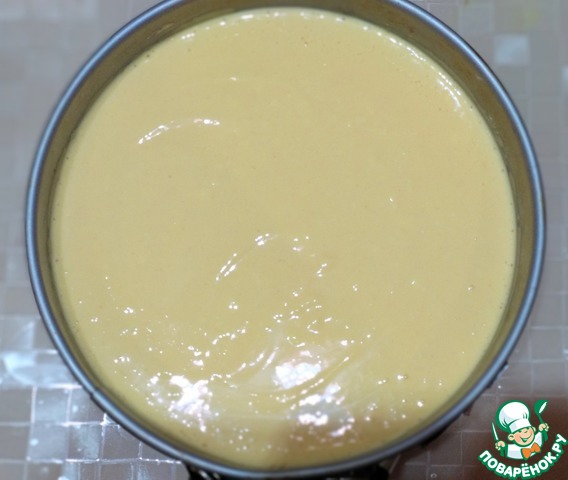 Полученную массу распределить в разъёмной форме для выпечки (диаметр 20 см), застеленной пергаментной бумагой.