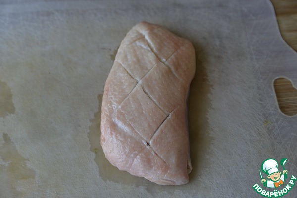 У меня весь расчёт на одну утиную грудку - 1 порцию. Утиную грудку моем, обсушиваем бумажным полотенцем. Делаем крестообразные надрезы на коже острым ножом, не задевая мякоть.