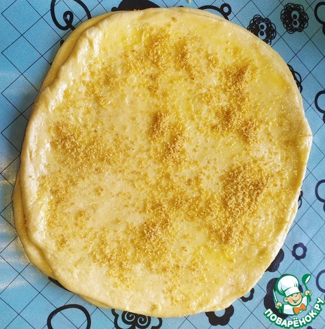 Затем каждый колобок раскатываем в круг диаметром 26-28 см. Первый раскатанный круг смазать топленным (можно растительным) маслом, сверху посыпаем сахаром и затем посыпаем орехами. Сверху выкладываем второй круг и повторяем. С третьим кругом проделываем тоже самое, а с 4-й - мы накрываем и уже ничем не смазываем.