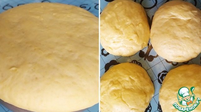 Когда тесто поднимется нужно его поделить на 4 ровные части, формируем колобки.