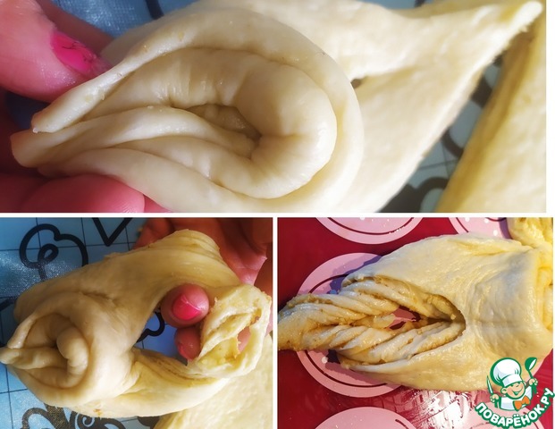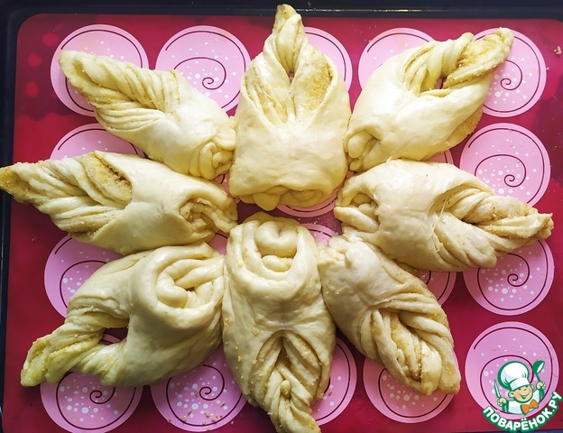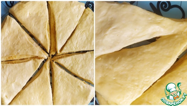 Затем две части нашего треугольника скрепляем, а одну просовываем через надрез и кладем наш треугольник на противень, повторяем все тоже самое с остальными треугольниками.