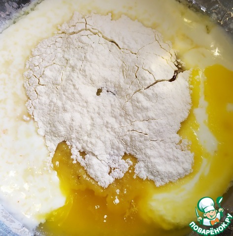 Начнем с приготовления теста. В теплый кефир добавляем яйца, сахар, дрожжи и перемешаем. Далее добавляем растопленное сливочное масло, соль, и постепенно всыпаем просеянную муку с крахмалом.