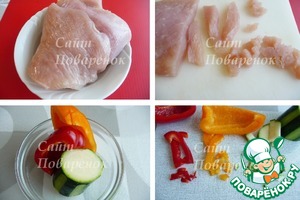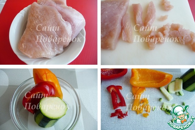 Филе индейки нарезать на полоски, а затем мелкими кубиками. Резаное мясо в котлетах более сочное. Перец (двух цветов) промыть, удалить семена и нарезать мелкими кубиками. У цуккини частично снять кожуру, нарезать также мелко, как и перцы.