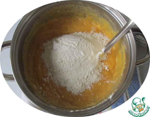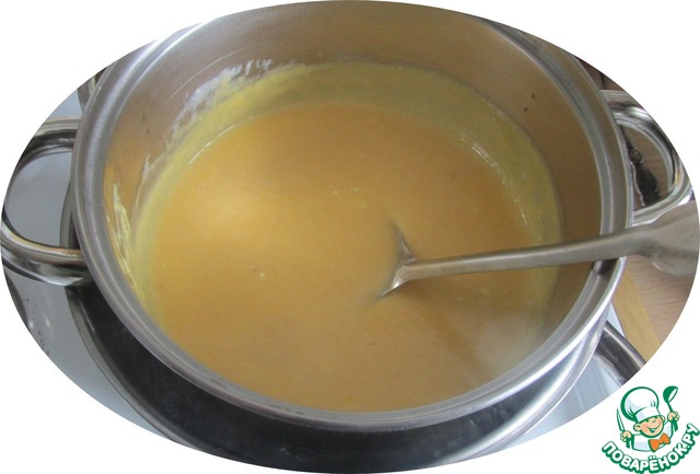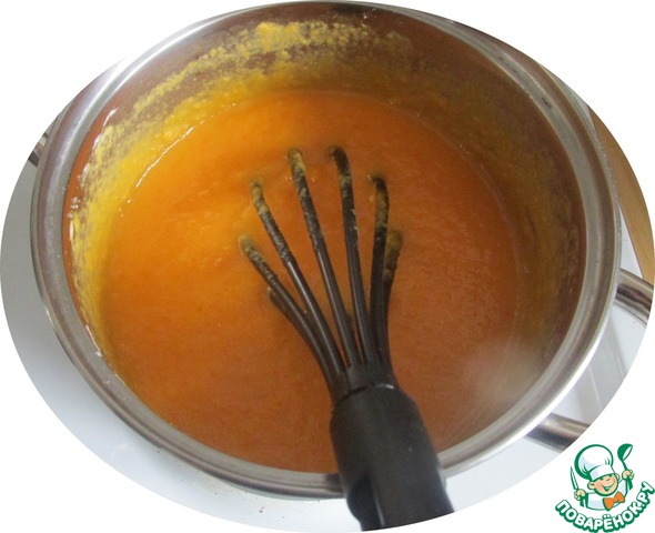 Разбиваем в тыквенное пюре яйца, добавляем сок и цедру лимона, сахар, крахмал и муку, перемешиваем. Ставим на огонь чуть выше среднего и постоянно мешая варим минут 10 до начала закипания, до первых бульков -