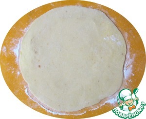 На листе пергамента или на силиконовом коврике, чуть присыпав его мукой, раскатываем кусочек теста максимально тонко в круглую лепешку около 24 см в диаметре