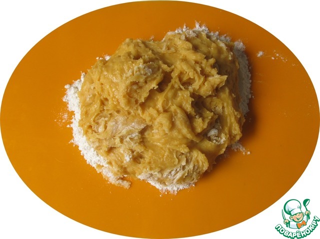 Как только мешать ложкой становится трудно, насыпаем остаток муки на поверхность (стол, доска, силиконовый коврик) и вываливаем тесто из кастрюльки