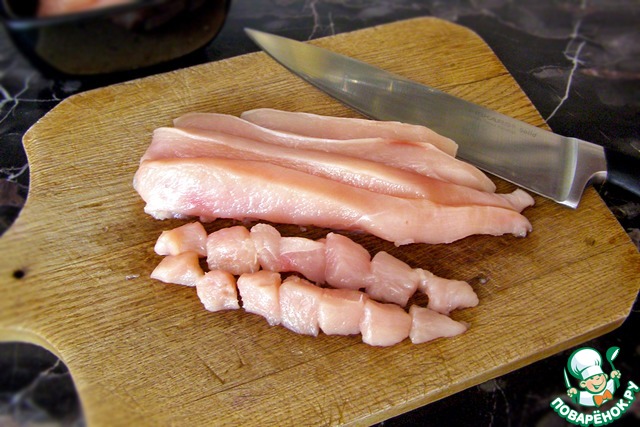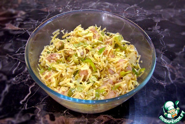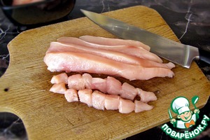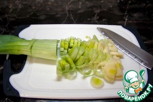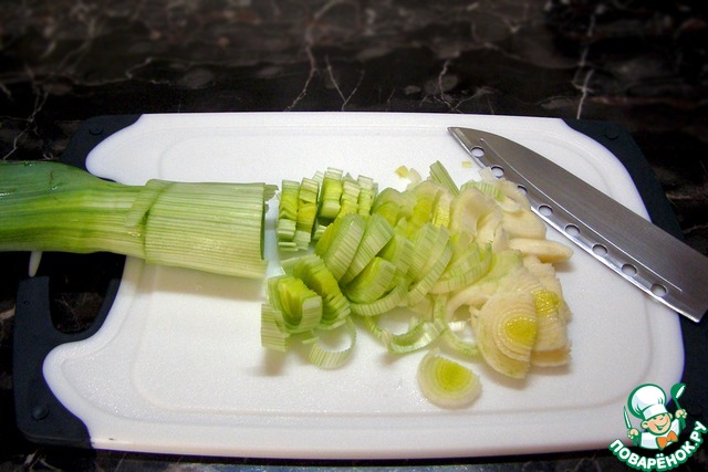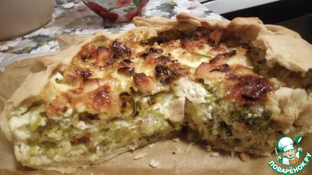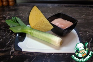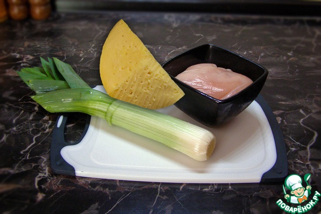 Подготовим продукты для начинки: лук, филе птицы и сыр. Настоятельно рекомендую использовать именно лук-порей. Я пробовала готовить и с репчатым, и с зеленым луком, но самый нежный вкус у пирога получается именно с луком-пореем.