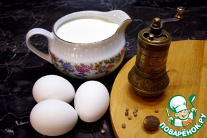 Подготовим продукты для заливки: яйца, сливки (у меня 20%) и пряности. Мне нравятся в этом пироге мускатный орех и белый перец. Также, при желании, можно добавить немного свежей или сушеной зелени. Выбирайте травки с деликатным ароматом и вкусом, чтобы не заглушить нежный вкус пирога.