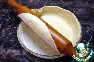 Готовое тесто раскатаем в форме круга, диаметром немного больше, чем форма для запекания. Накрутив тесто на скалку, перенесем его на форму.