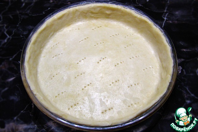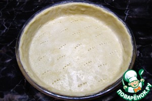 Распределим тесто по форме, закрывая бортик по всей высоте. После этого тесто надо наколоть вилкой.