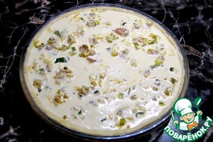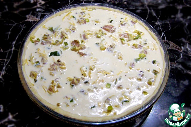 Равномерно выложим начинку и сверху польем приготовленной заливкой, предварительно еще раз хорошо ее перемешав. Пирог поставим в духовку, заранее разогретую до 200*С. Выпекаем до золотистой корочки. У меня на это уходит приблизительно 90 минут или немного больше.