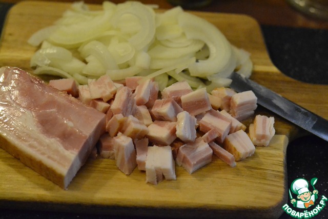 Лук нарезать полукольцами, буженину нарезать на маленькие кусочки.