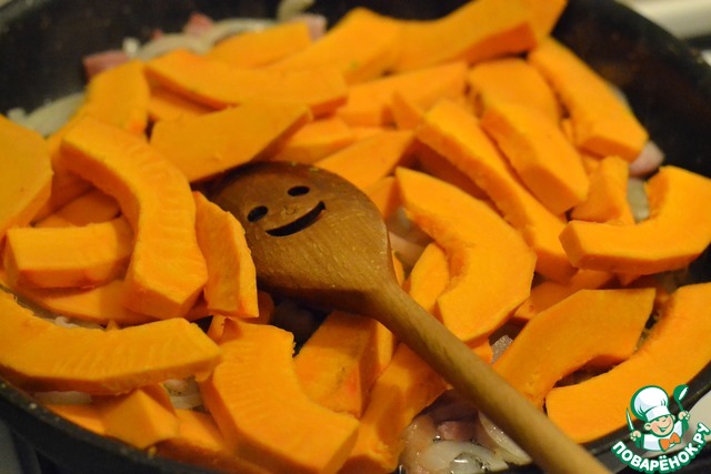 Добавить нарезанную тыкву. Жарить до полуготовности. Посолить и поперчить по вкусу.