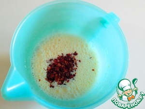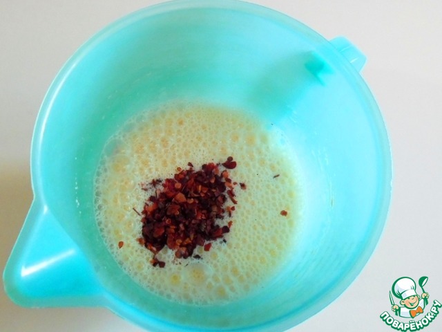 Смешать миксером или венчиком. Добавить перец хлопьями.