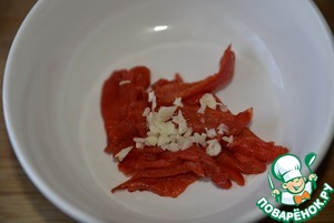 Перец чистим, снимаем кожицу, режем на полоски, поливаем лимонным соком, добавляем рубленный чеснок, соль, смесь перцев и оставляем мариноваться.