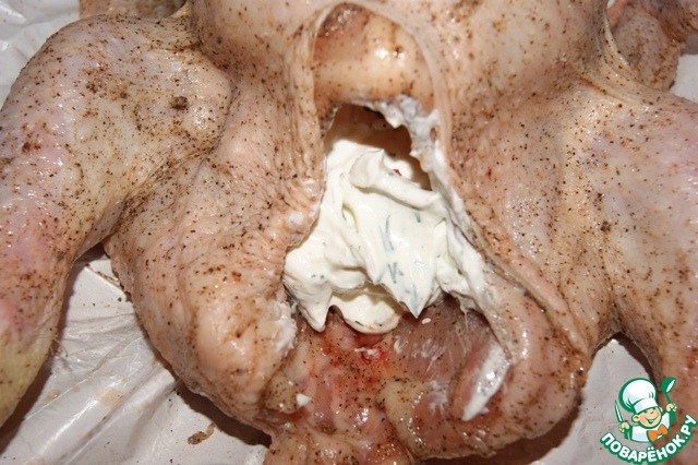 Курицу натереть солью и перцем. Жир срезанный с нижней части поместить под кожу в области грудки (она будет сочнее, а после запекания ее нужно удалить).