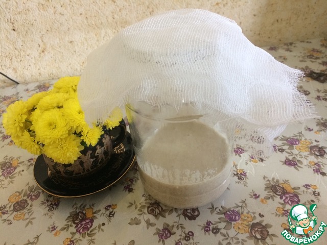 Насыпаем в литровую банку 100 грамм ржаной обдирной муки, наливаем 200 грамм воды и тщательно перемешиваем, чтобы не было комочков. Накрываем банку марлей в несколько слоёв, и ставим в тёплое место, без сквозняков. Важно, чтобы место было просто тёплым, а не жарким, иначе наша закваска прокиснет. Конечно, закваску можно начинать и из пшеничной муки. Но по своему опыту могу сказать, что легче всего «запустить» этот процесс в правильно направлении, именно используя ржаную муку.