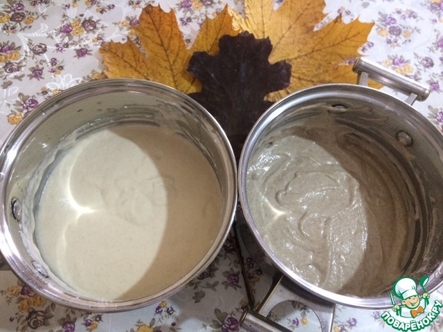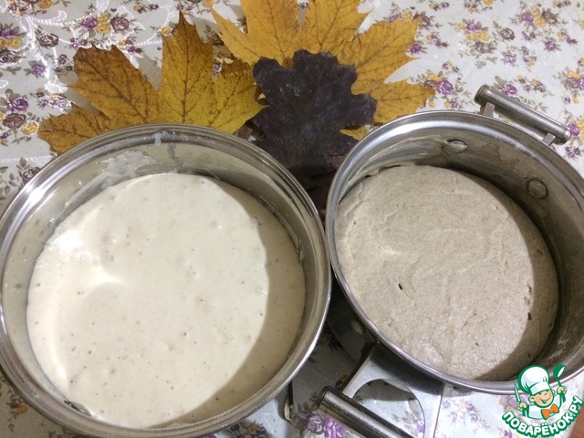 В две ёмкости наливаем по 9 столовых ложек нашей закваски, в каждую добавляем чуть меньше столовой ложки растительного масла, по 230 грамм воды, тёплой, из-под крана, по 1 чайной ложки соли (почти без верха) и сахара. Перемешиваем. Теперь в одну кастрюльку добавляем грамм 400-450 ржаной муки, а в другую – 500 грамм пшеничной. Всё тщательно перемешиваем, чтобы не было комочков. Тесто должно получиться чуточку гуще, чем тесто для оладий. Накрываем крышкой и ставим в тёплое место.