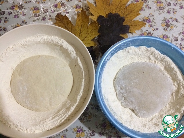 Когда наше тесто поднимется ещё раз, опять аккуратно обминаем. Приподнимаем край теста и второй рукой легонько стряхиваем муку. И так продвигаемся по кругу по краю теста. Выкладываем тесто на разделочную доску, делим на две части. Каждый кусочек теста вымешиваем до гладкости и придаём форму продолговатой булочки.