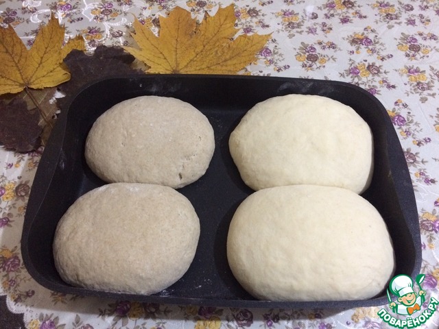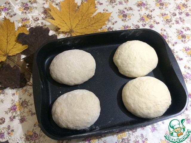 Так как формы для выпечки хлеба я меня нет, то я выкладываю тесто в противень. Он должен быть толстостенным, чтобы хлеб равномерно пропёкся, и не остался сырым внутри. В итоге получаем четыре булочки. Накрываем кухонным полотенцем и ставим в тёплое место.