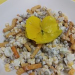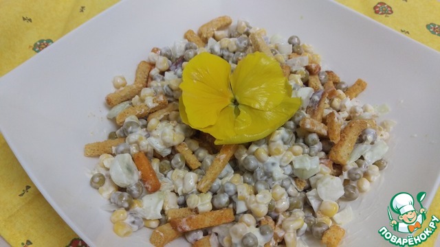 Лук добавляем к кукурузе и горошку, туда же 2 пачки "кириешек", все заправляем майонезом и все!