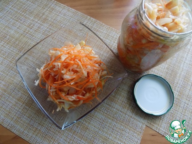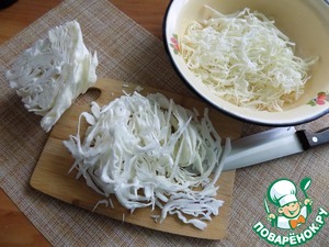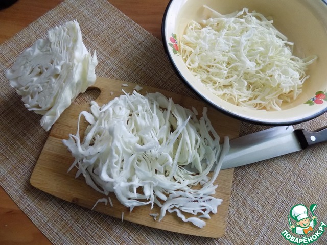 Начинаем делать салат. Заправку к салату делать сразу не нужно, смешивая все ингредиенты для неё. Мы будем добавлять их в процессе готовки, постепенно. Режем тонко капусту. Я люблю в этом салате длинную капусту. Нам понадобится большая эмалированная чаша или стеклянная, где удобно будет перемешивать все ингредиенты. Выкладываем капусту в чашу.