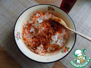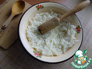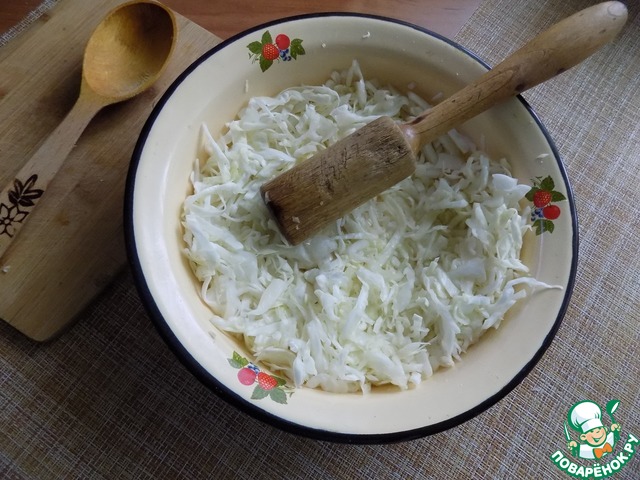 Посыпаем капусту солью и сахаром и бьём толкушкой. Я для этого всегда использую деревянную толкушку, впрочем, как и деревянную ложку для смешивания ингредиентов. Овощи не окисляются.
