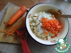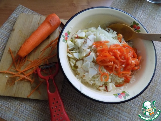 Капуста даст сок, его ещё много в ней. Нарезаем овощи. Я режу в этот салат так: лук репчатый полу-кольцами, чеснок мелко рублю, яблоки режу тонкими и небольшими пластинами, убрав серединку, перец болгарский режу пополам, а затем тонкой "стружкой". Выкладываем овощи к капусте. Морковь я натираю корейской тёркой длинной "лапшой". Если нет корейской тёрки, просто натрите её на средней тёрке. Длинная "лапша" моркови в салате красиво смотрится.