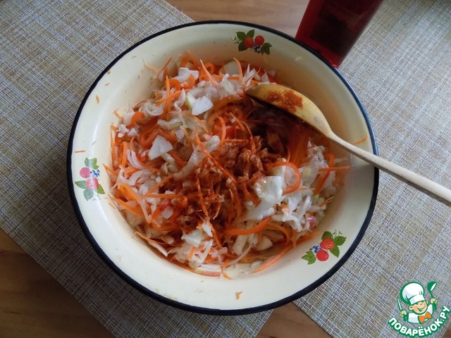Отправляем морковь тоже в чашу. Перчим. Я использую перец-кайен. Можно использовать любой другой, вами любимый. Наливаем уксус в ложку и поливаем салат. Перемешиваем. Последнее из заправки-подсолнечное масло. Его лучше брать нерафинированное ароматное. Опять всё соединяем и салат готов. Вот здесь вы можете подкорректировать вкус под себя. Посолить, добавить сахар или уксус. Если вы не едите салаты с уксусом, то его можно заменить лимонным соком, будет более мягкий вкус. Для меня это оптимальный вариант добавки сахара, соли, уксуса и перца для количества овощей, которое я указала.