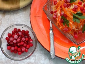 Выкладываем салат в салатник для подачи. Украшаем его листиками петрушки и замороженной ягодой. У меня калина. Я очень её люблю и уважаю. Это кладезь витаминов и она придаст салату пикантную горчинку.