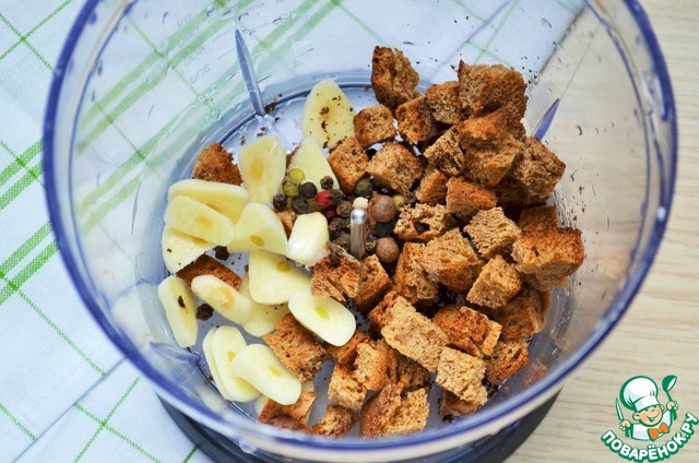 Выложить в блендер с кусочками чеснока и горошинами перцев.