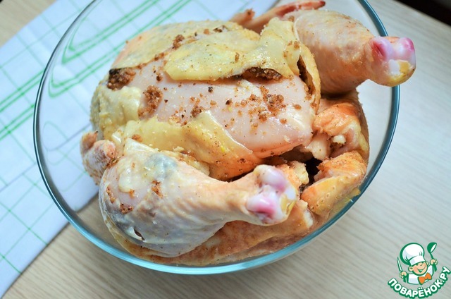Курицу накрыть плёнкой и убрать в прохладное место - на 2 - 12 часов.