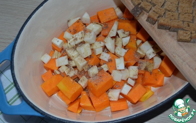 Перед приготовлением тыкву и сельдерей почистить, нарезать.