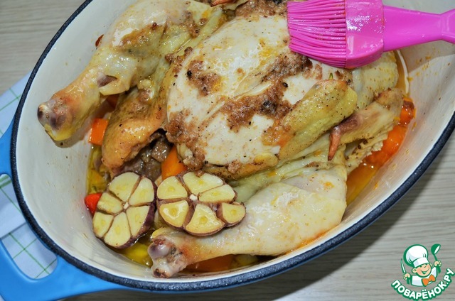 [+5]Шикарная курица вышла с ароматом хлеба и чеснока. У меня мариновалась сутки. Тыкву и сельдерей мы не едим, поэтому курица в гордом одиночестве))))