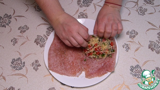 На каждое филе выложить по 1/2 начинки. Свернуть рулетиком. Обмотать ниткой.