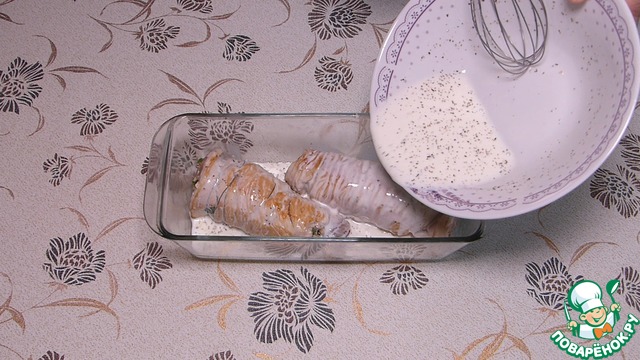 Укладываем обжаренные рулетики в смазанную маслом форму, заливаем соусом.