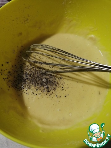 В миску добавить яйца, муку, соль и сметану и взбить вечником.