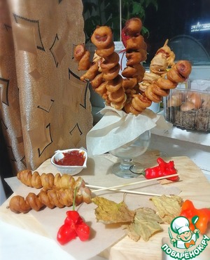 Сосиски надеваем на длинную шпажку и делаем надрезы покругу и растягиваем в спиральку.