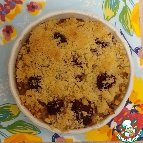 Распределить крошку поверх фруктов. Готовить в духовке, заранее разогретой до 180-190 гр., 25-30 минут.