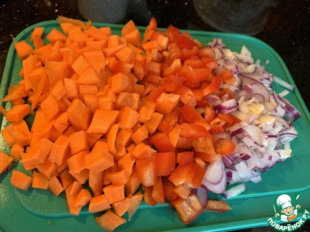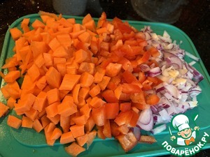 Мелко нарежьте лук, болгарский перец и морковь.