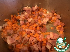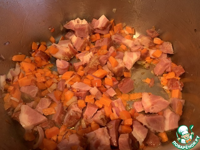 Добавьте мясо срезанное с ребрышек, обжарьте.