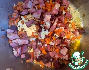 Добавьте колбаски, чеснок, выдавленный прессом, перец (перец добавляйте на свой вкус, у меня муж любит очень острый) и паприку.