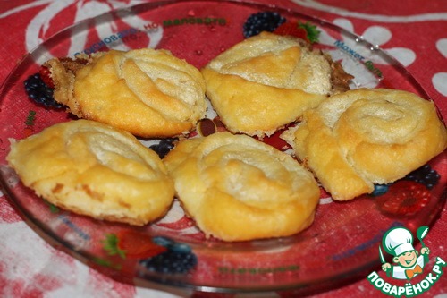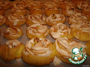 Укладываем срезом на противень, покрытый бумагой для выпечки, в серединку каждой"розочки"втыкаем орешек, я использовала грецкие, их хватит и половинки на каждую печенюшку